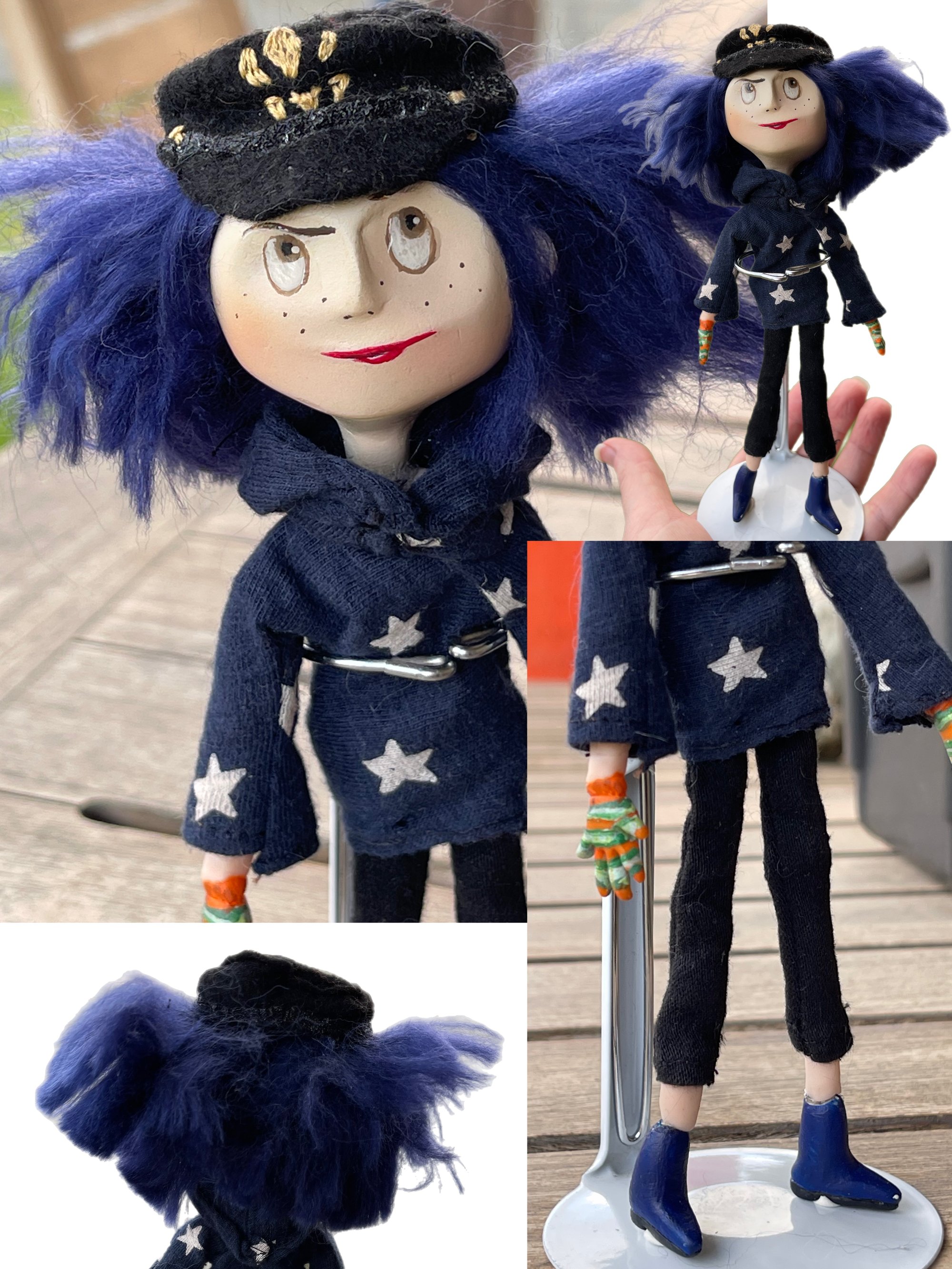 Hand made with polymer clay and wire. Custom painted and clothes are hand sewn. Approximately 6” tall. Comes with stand. Collectors doll for display only-not for children or play