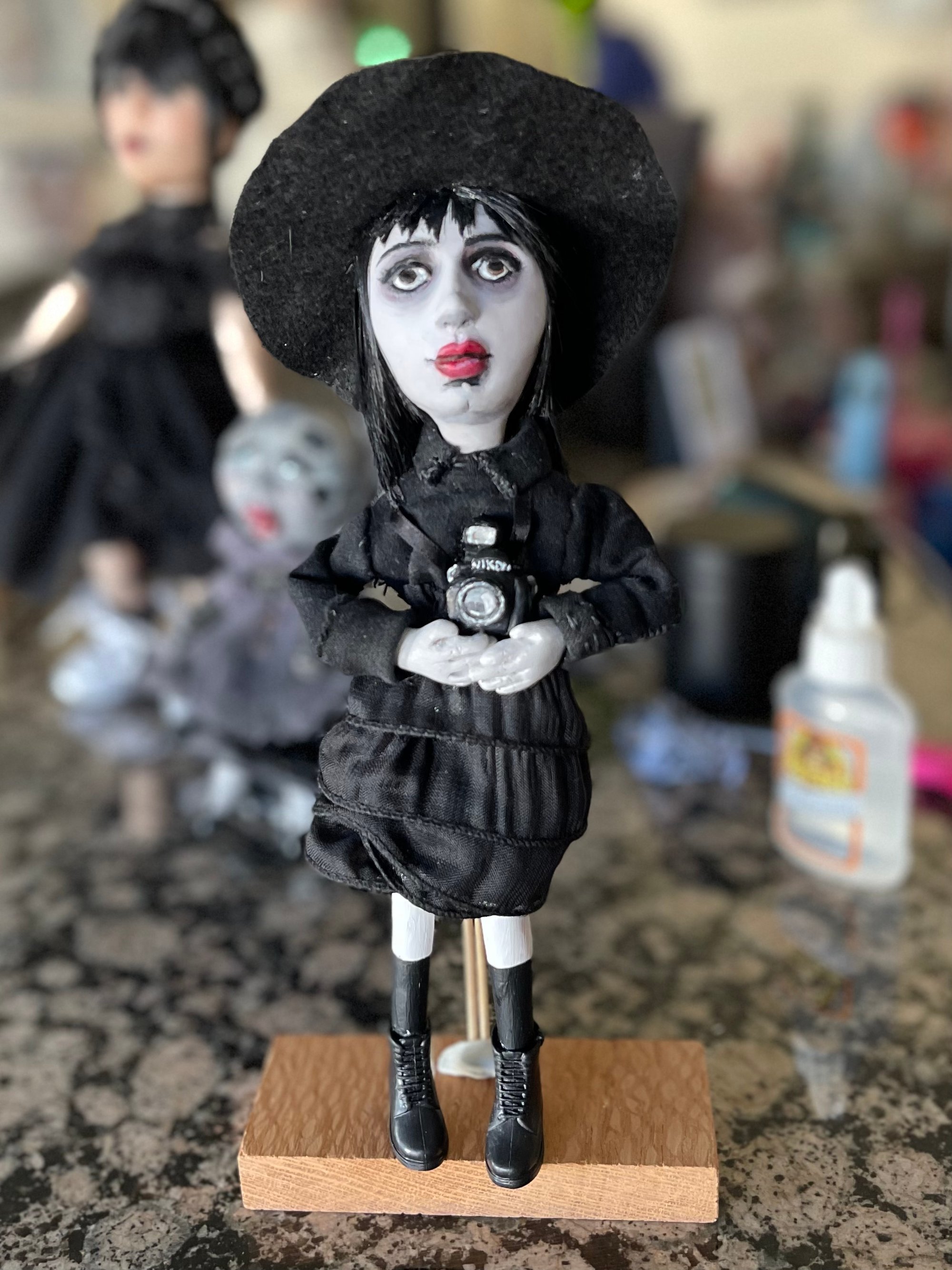 Sculpted by hand using polymer clay. Hand sewn clothes and custom painted. Approximately 8 inches tall Comes with stand